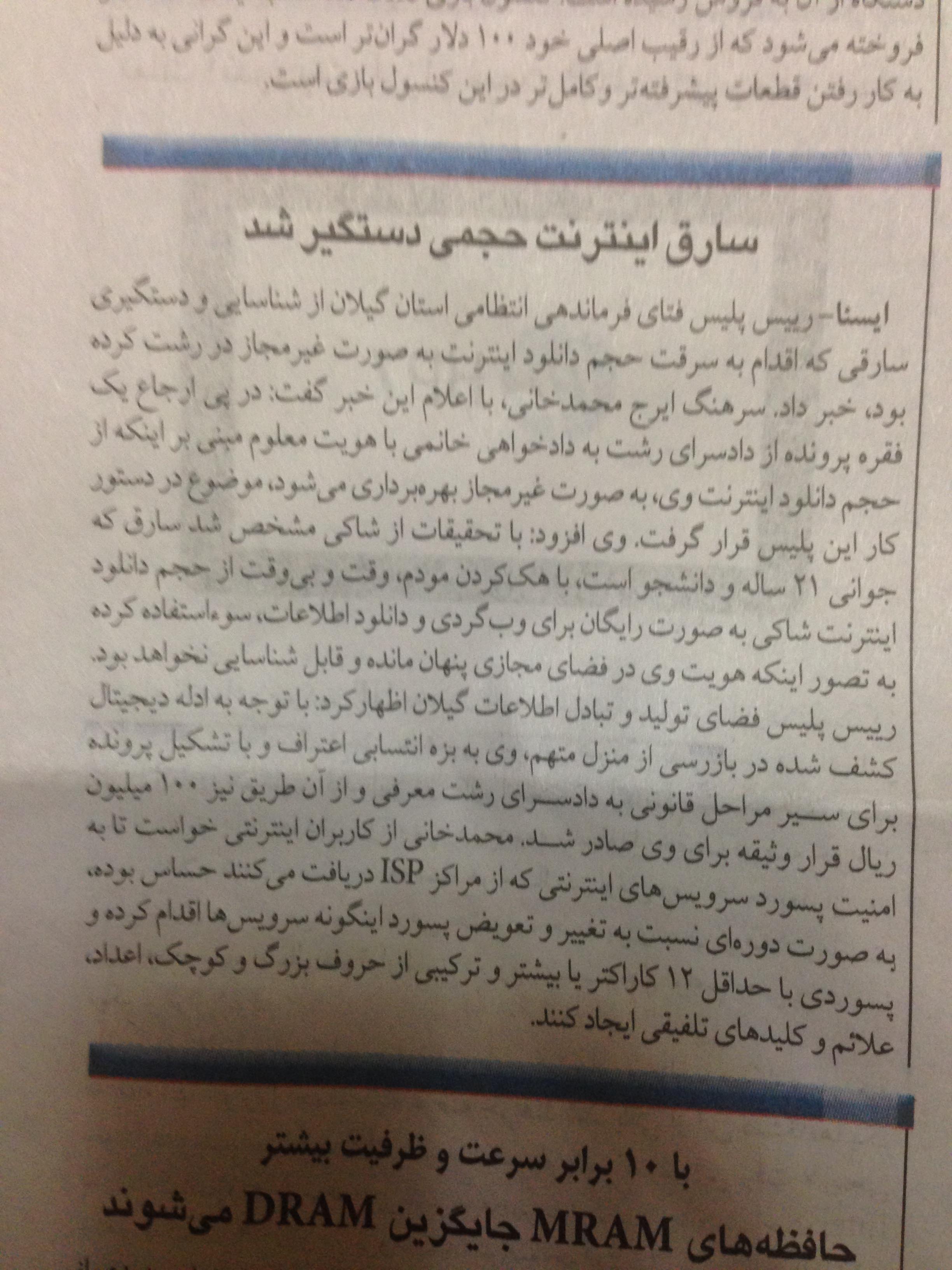اگر به دید قانونی بخوایم نگاه کنیم این کار کاملا غیر قانونی است و نوعی سرقت حساب میشه ! ولی اینکه این خبر در روزنامه چاپ شه که "ما کسی رو دستگیر کردیم که از اینترنت همسایه اش یواشکی استفاده میکرد" به نظر من اصلا منطقی نیست !